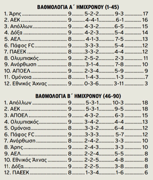 Αυτή η βαθμολογία προκύπτει από το σκορ που έχουν οι ομάδες σε αυτά τα δύο ημίχρονα. Ένα αξιοσημείωτο στατιστικό είναι ότι η Ομόνοια να είναι σε… θέση διαβάθμισης στο πρώτο μέρος, δείγμα του γεγονότος πως σε αυτό το διάστημα έχει κάκιστη παρουσία. Στην επανάληψη είναι εμφανώς βελτιωμένη.