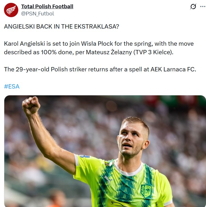 «Ο Κάρολ Αγκιέλσκι ετοιμάζεται να πάρει μεταγραφή για την Βίσλα Μπλοκ. Η κίνηση χαρακτηρίζεται 100% τελειωμένη»