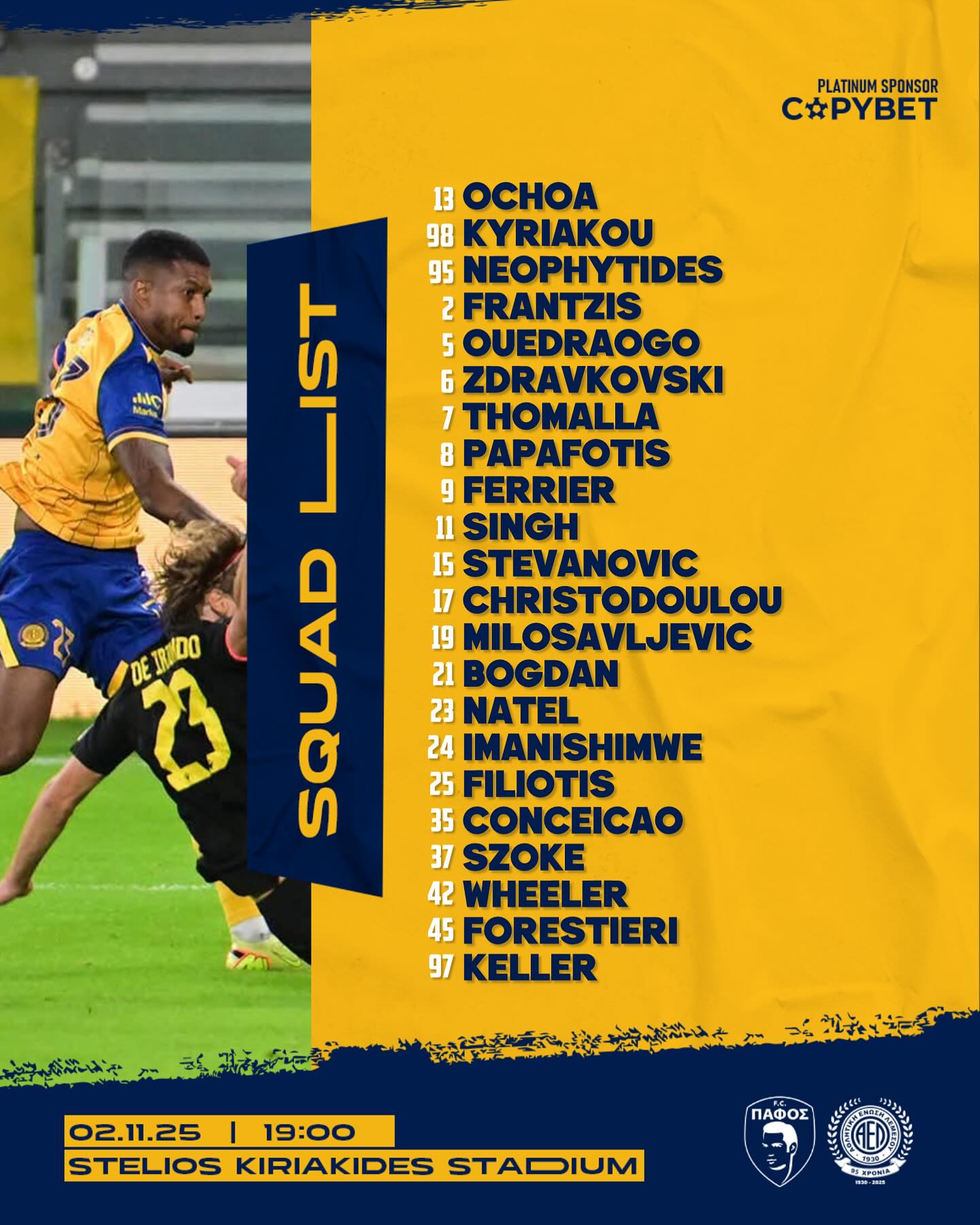 Ο Ούγκο Μαρτίνς ανακοίνωσε την αποστολή για το παιχνίδι στο «Στέλιος Κυριακίδης». Εκτός οι Γκλάβσιτς, Ζράντι, Παναγή, Κεραυνός και Νεοφύτου. Απρόοπτο και με τον Αντρέα Μακρή που ένιωσε ένα σφίξιμο στον δικέφαλο και έμεινε εκτός.