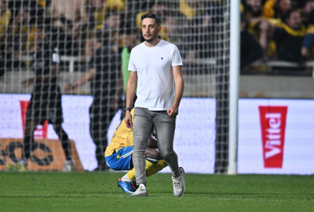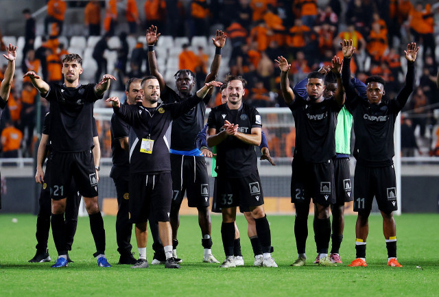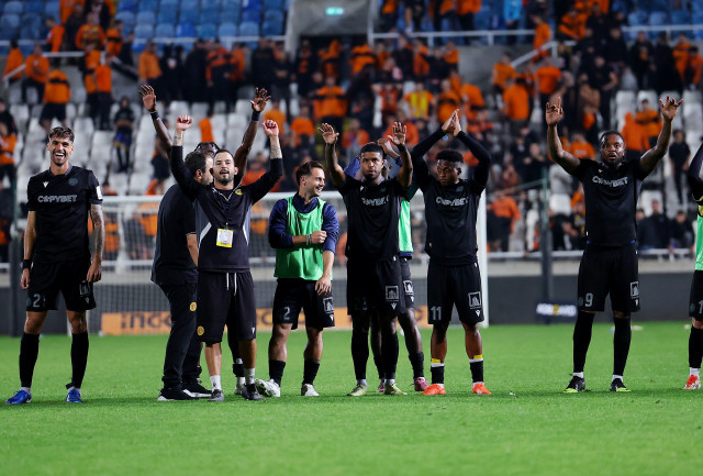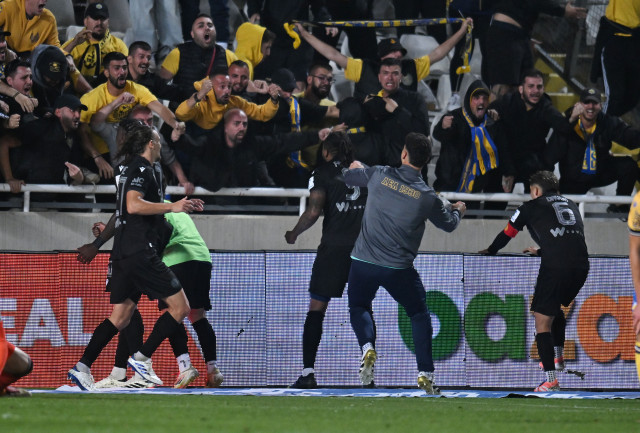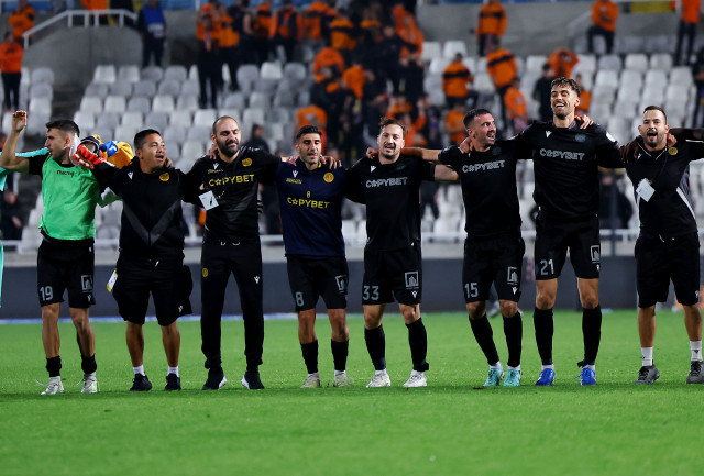 Μαζί με τους παίκτες και ο Γιώργος Ελευθερίου ο οποίος έτρεξε προς το πέταλο για να πανηγυρίσει με τους παίκτες του.