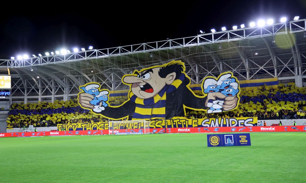Δείτε το κορεό που ανήρτησαν οι οργανωμένοι οπαδοί της ΑΕΛ στο ντέρμπι με τον Απόλλωνα, με πρωταγωνιστές τον δρακουμέλ και τα στρουμφάκια.