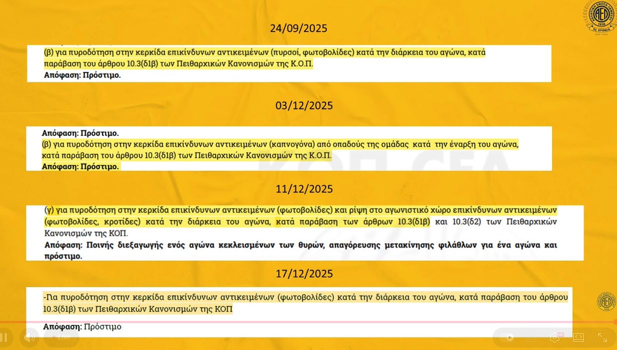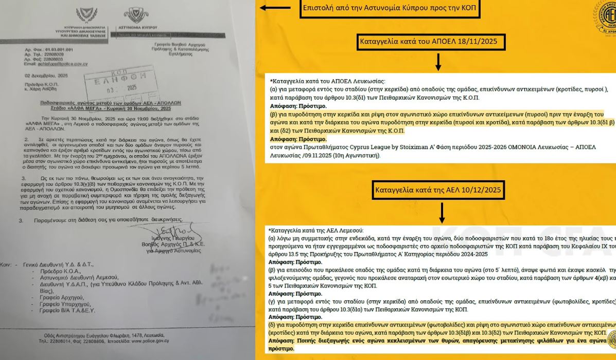 «Μετά τον αγώνα με τον Απόλλλωνα τιμωρηθήκαμε από τον Αθλητικό Δικαστή. Οι ποινές δεν είναι ίδιες σε όλες τις αποφάσεις του Αθλητικού Δικαστή. Πιστεύουμε ότι ένας σημαντικός λόγος είναι η παρέμβαση του αρχηγείου της αστυνομίας. Ζήτησε να γίνει τιμωρία της έδρας και των δύο ομάδων για το δουν αυτό και οι υπόλοιπες ομάδες. Αυτό είναι ξεκάθαρα επέμβαση στην ΚΟΠ. Μετά είχαμε κάνει ένσταση στο εφετείο την Δευτέρα το μεσημέρι. Μας είπαν την Τρίτη ότι η εκδίκαση θα γίνει τη Πέμπτη. Ο υπεύθυνος του νομικού μας τμήματος ταξίδευε για Λονδίνο πριν την ενημέρωση της ΚΟΠ. Εμείς ζητήσαμε να γίνει η ακρόαση την επόμενη βδομάδα. Μας απάντησαν σήμερα το πρωί ότι πρέπει να αλλάξουμε δικηγόρο. Δεν ξέρω σε ποιο κράτος του κόσμου μπορεί να γίνει αυτό. Ο νέος δικηγόρος πρέπει να μελετήσει την υπόθεση σε λίγες ώρες. Μπορεί στην Ουγκάντα και την Αφρική να γίνονται αυτα. Εμείς θα πάμε στο εφετείο για τη παρέμβαση του κράτους της Αστυνομίας στις αποφάσεις του Αθλητικού Δικαστή. Μερικές βδομάδες πριν είχε παρεπεμφθεί το ΑΠΟΕΛ και δέχτηκε πρόστιμο για τον ίδιο λόγο. Εμείς δεχτήκαμε στέρηση έδρας και εκταντοντάδες χιλιάδες ευρώ. Ένα άλλο σωματείο, για άναμμα επικίνδυνο αντικειμένων δέχτηκε πρόστιμο. Σε μας, άνεση μεγάλη από τον κύριο Βρυωνίδη, ποινή έδρας. Για μένα ο κύριος Βρυωνίδης δεν μπορεί να ανταποκριθεί σε αυτή τη θέση. Οι ποινές είναι κωδικοποιημένές. Είναι δύο μέτρα και δύο σταθμά, ξεκάθαρα»