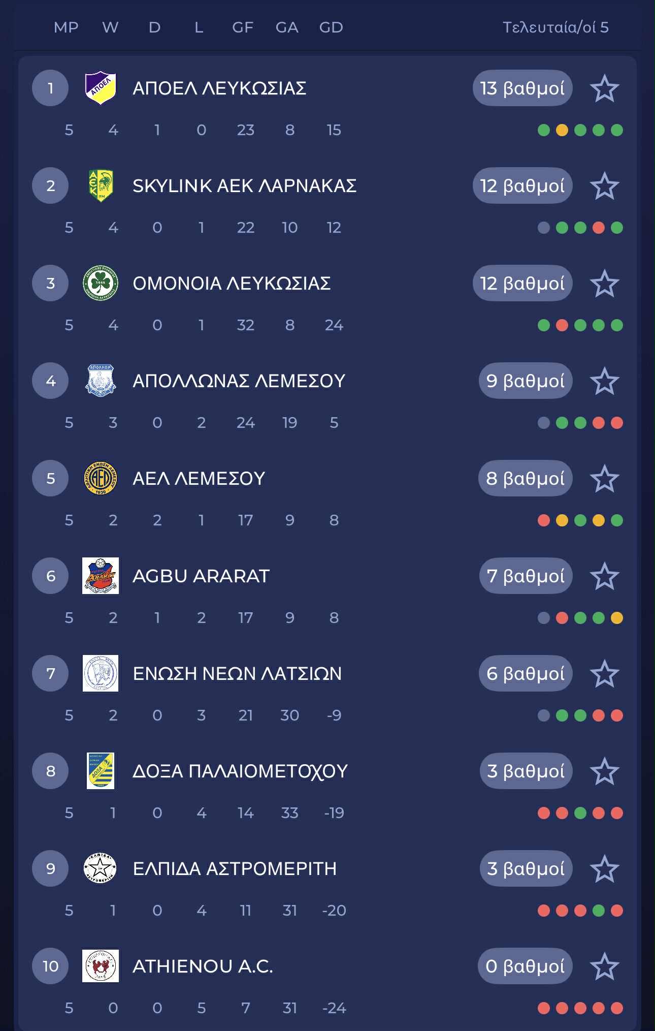 Στην κορυφή της βαθμολογίας παραμένει το ΑΠΟΕΛ με 13 βαθμούς, ενώ ΑΕΚ και Ομόνοια ακολουθούν σε απόσταση αναπνοής, έχοντας από 12.
