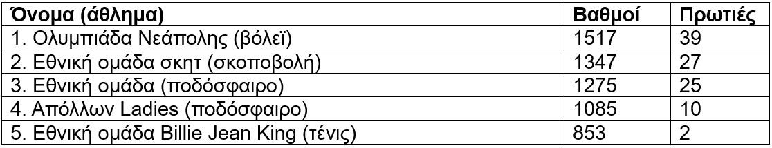 Η Ολυμπιάδα, που πέραν του νταμπλ διαπρέπει και στο CEV Challenge Cup όπου η πορεία της συνεχίζεται, κατετάγη πρώτη με 1.517 βαθμούς και 39 πρωτιές, ενώ τη δεύτερη θέση κατέλαβε η εθνική ομάδα σκητ στη σκοποβολή με 1.347 βαθμούς και 27 πρωτιές, έχοντας κατακτήσει το αργυρό μετάλλιο στο Παγκόσμιο Πρωτάθλημα Σκοποβολής του 2025 στην Αθήνα με τις Κωνσταντίνα Νικολάου, Παναγιώτα Ανδρέου και Αναστασία Ελευθερίου. Από κοντά ακολουθεί στην τρίτη θέση η εθνική ποδοσφαίρου (1.275β. και 25 πρωτιές) που για πρώτη φορά έφθασε κοντά στην άνοδο στη β’ κατηγορία του UEFA Nations League.
