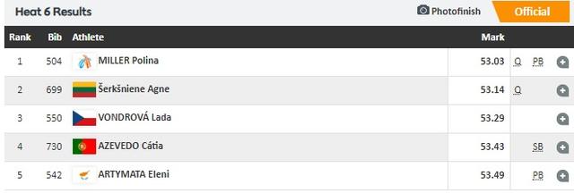 Η αθλήτριά μας τερμάτισε στην πέμπτη θέση (από τις πέντε αθλήτριες) στην έκτη προκριματική σειρά, με χρόνο 53.49, που αποτελεί την καλύτερη προσωπική της επίδοση