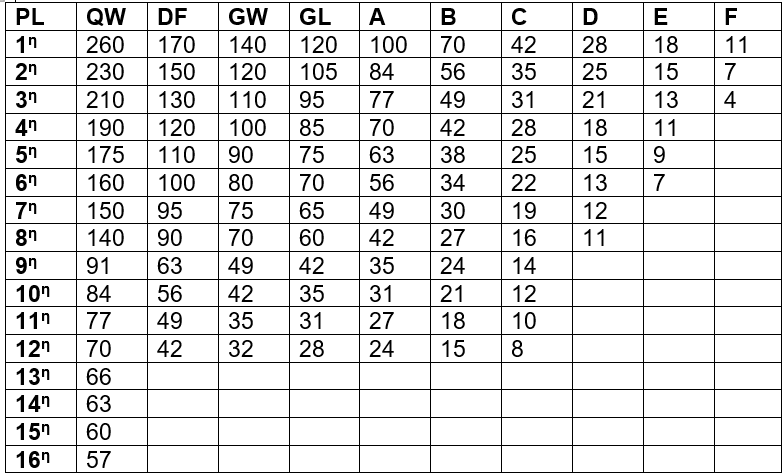 Πιο κάτω σάς παρουσιάζουμε και τον νέο πίνακα για τους βαθμούς που θα κερδίζουν οι αθλητές και οι αθλήτριες αναλόγως τής θέσης κατάταξής τους στις διάφορες αξιολογημένες διοργανώσεις. Για τα αγωνίσματα των 5.000μ., 10.000μ. και 3.000μ. στιπλ ισχύσουν διαφορετικές βαθμολογίες.