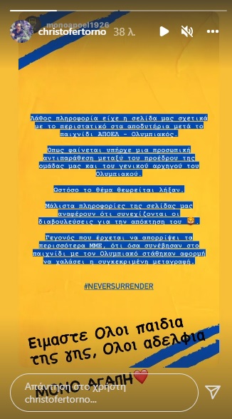 Ο αρχηγός του ποδοσφαιρικού τμήματος του Ολυμπιακού αναδημοσίευσε στο Instagram μια ανάρτηση οπαδικής σελίδας του ΑΠΟΕΛ, στην οποία γίνεται λόγος για λάθος πληροφορία σε σχέση με το περιστατικό στα αποδυτήρια μετά το τέλος του αγώνα των δύο ομάδων, ενώ επιπλέον παρατίθεται η πληροφορία πως συνεχίζουν οι διαβουλεύσεις για μεταγραφή του Σαρφό στους γαλαζοκίτρινους.