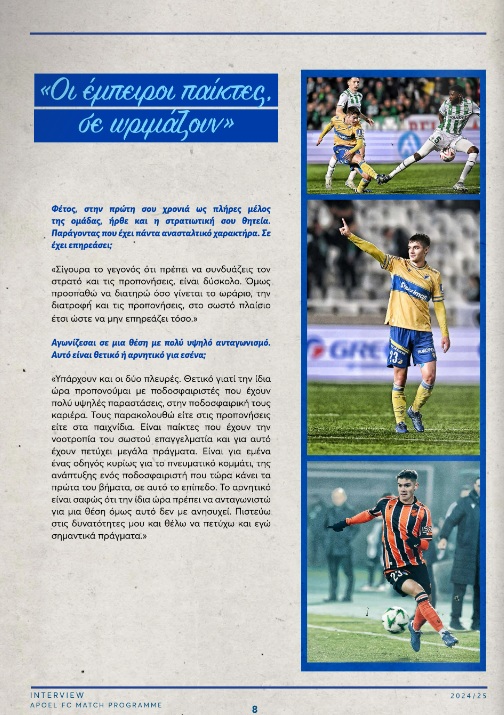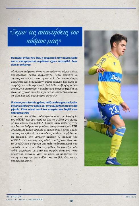 Ο νεαρός ποδοσφαιριστής του ΑΠΟΕΛ αναφέρεται στην εκπλήρωση ενός ονείρου, τους στόχους της ομάδας και την προσπάθεια να συνδυάσει τις ποδοσφαιρικές υποχρεώσεις με τον στρατό