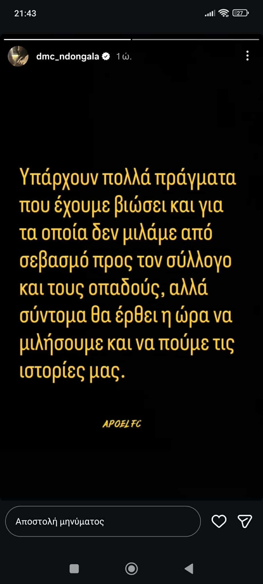 «Πολλοί άνθρωποι με ρωτούν για τη γνώμη μου και τι πιστεύω για την κατάσταση στο ΑΠΟΕΛ. Είναι λυπηρό για τον μεγαλύτερο σύλλογο της χώρας αλλά όταν έχεις ηγέτες που λένε συνέχεια ψέματα και διοικούν χωρίς όραμα, είναι αναμενόμενο. Υπάρχουν πολλά πράγματα που έχουμε βιώσει και για τα οποία δεν μιλάμε από σεβασμό προς τον σύλλογο και τους οπαδούς, αλλά σύντομα θα έρθει η ώρα να μιλήσουμε και να πούμε τις ιστορίες μας».