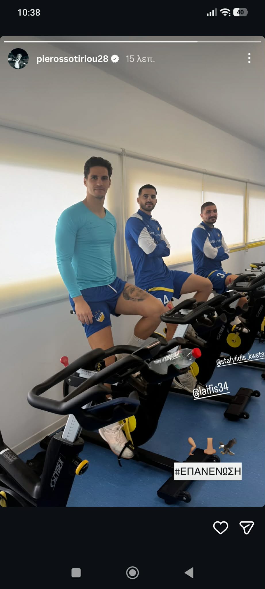 Mετά την επιστροφή του Πιέρου Σωτηρίου από την Μπολόνια, όπου βρισκόταν σε εξειδικευμένο κέντρο αποκατάστασης, ο Κύπριος επιθετικός του ΑΠΟΕΛ βρέθηκε ξανά με τους άλλους δυο τραυματίας των γαλαζοκιτρίνων, Κωνσταντίνο Λαΐφη και Κώστα Σταφυλίδη, δημοσιεύοντας σχετική φωτογραφία από τον Αρχάγγελο.
