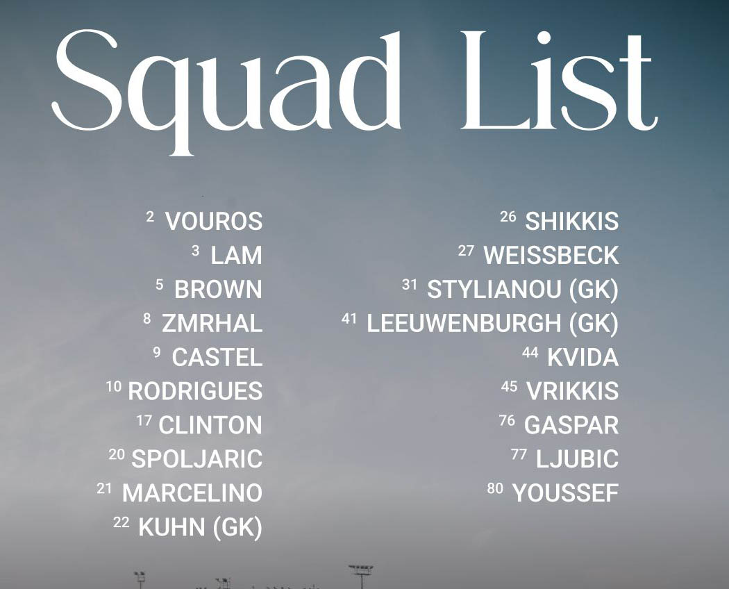 Απών λόγω καρτών είναι και ο Μπράντον Τόμας. Η αποστολή απαρτίζεται από 19 παίκτες: