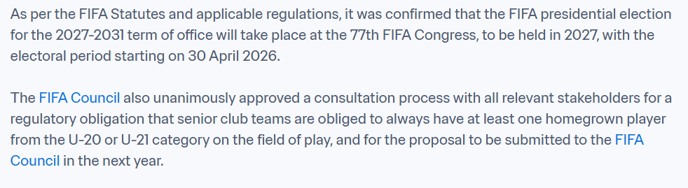 O conselho da FIFA aprovou por UNANIMIDADE um processo de pesquisa para uma regulamentação do uso de jovens. A ideia é de que os clubes profissionais sejam OBRIGADOS a ter um jogador Sub21 da base em CAMPO.
