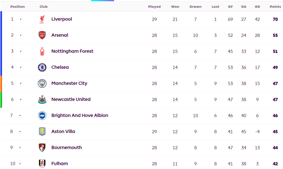 Στους 46 βαθμούς βρίσκουμε την Μπράιτον και στους 45 την Άστον Βίλα, με την εντυπωσιακή Μπόρνμουθ να είναι ένατη με 44, δύο περισσότερους από τη δέκατη, Φούλαμ!