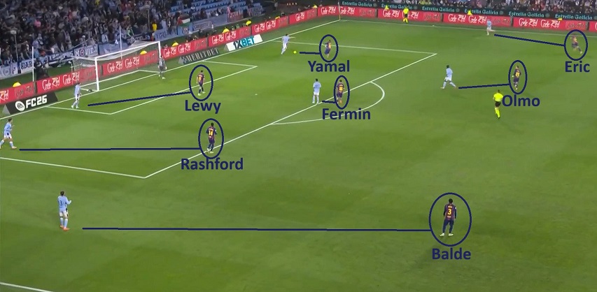 Η βαθμολογία και τα γκολ λένε την αλήθεια. Όσο ο Φλικ δεν συμμαζεύει αμυντικά τους πρωταθλητές Ισπανίας, τόσο θα θέτει σε κίνδυνο νέους τίτλους. Πώς όμως είναι εκτεθειμένη η ομάδα του 60χρονου κόουτς; Ο φορ, οι δύο εξτρέμ, ο επιτελικός μέσος και οι δυο χαφ πιέζουν ασφυκτικά και εμποδίζουν το build – up από τον αντίπαλο κίπερ. Παράλληλα, η τετράδα της άμυνας τοποθετείται στη μεσαία γραμμή. Προκύπτει αρχικά κενό μεταξύ μέσων και αμυντικών. Μία καλή κυκλοφορία της μπάλας διασπά το πρέσινγκ και μία μπαλιά στον χώρο δημιουργεί έξτρα κενό μισού γηπέδου! Ο εξτρέμ φεύγει στην πλάτη των Μπαλντέ, Γκαρθία, Κουμπαρσί και Κουντέ πασάρει στον ολομόναχο σέντερ φορ και η ζημιά γίνεται.