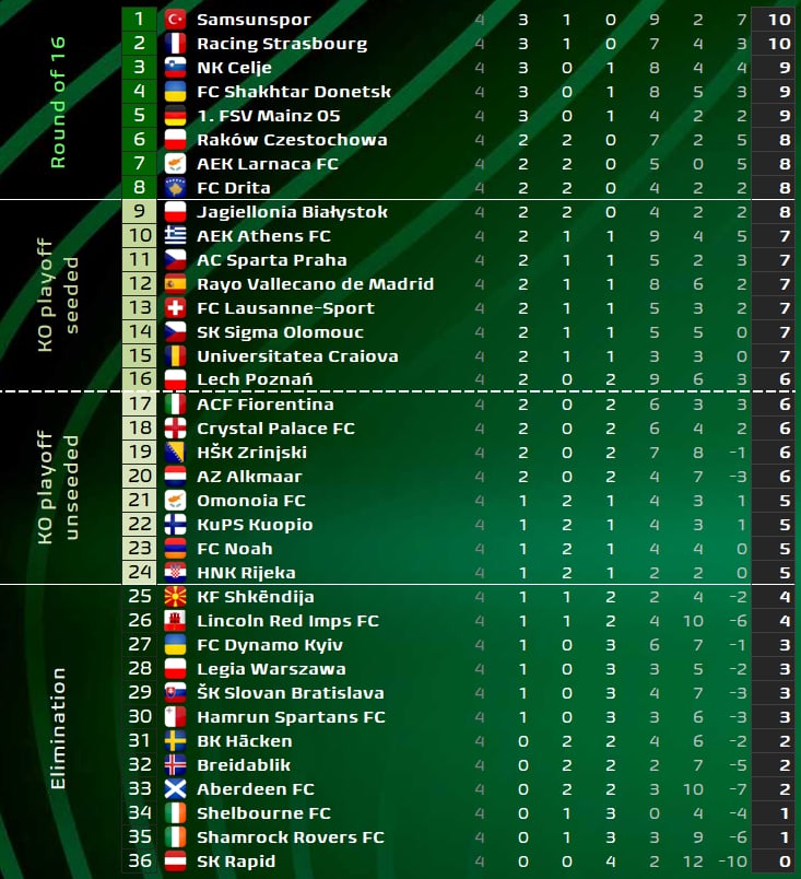Πρόκειται για μια κρίσιμη αγωνιστική καθώς απομένει μόλις μία… στροφή ακόμη και θα ξεκαθαρίσουν οι ομάδες που μπορούν να διεκδικήσουν πρόκριση. Φυσικά, θα φανεί και το ποιες ομάδες μπορούν να μείνουν σε τροχιά κορυφής.Διότι πέραν της πρωτοπόρου Σάμσουνσπορ που υποδέχεται την ΑΕΚ, το Στρασβούργο που έχει επίσης 10 πόντους δοκιμάζεται στη Σκωτία κόντρα στην Αμπερντίν.