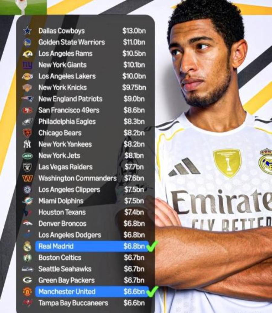 Η λίστα του Forbes με τη μεγαλύτερη αγοραστική αξία για το 2026 συνολικά διαθέτει 25 ομάδες από όλα τα αθλήματα σε όλον τον κόσμο, αλλά μόλις δύο ποδοσφαιρικές, τις Ρεάλ Μαδρίτης και Μάντσεστερ Γιουνάιτεντ, οι οποίες βρίσκονται χαμηλά στη σχετική κατάταξη του περιοδικού, αφού τους δυο λαοφιλείς συλλόγους ξεπερνούν ομάδες του ΝΒΑ και του NFL.
