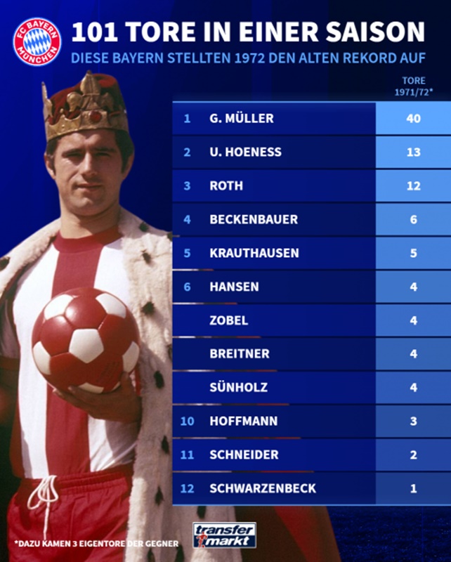 Το 1971/72, ωθούμενη από τα 40 γκολ του Γκερντ Μίλερ, τα οποία για πολύ καιρό αποτελούσαν το ρεκόρ για έναν παίκτη στη Bundesliga Μπουντεσλίγκα, η Μπάγερν Μονάχου έφτασε τα 101 γκολ μετά από μια νίκη με 5-1 την τελευταία αγωνιστική εναντίον της Σάλκε.