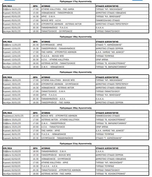 Στο σημερινό (6/12) Δ.Σ. της Λίγκας εγκρίθηκε το πρόγραμμα του πρωταθλήματος από τη 17η έως και την 26η αγωνιστική, μέχρι το φινάλε δηλαδή του β' γύρου της Super League.