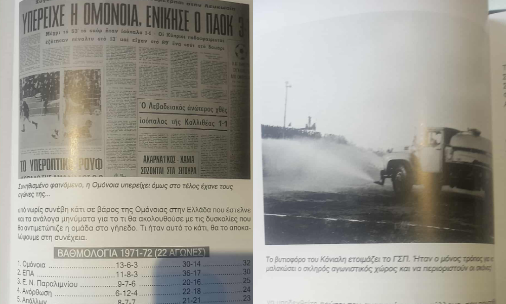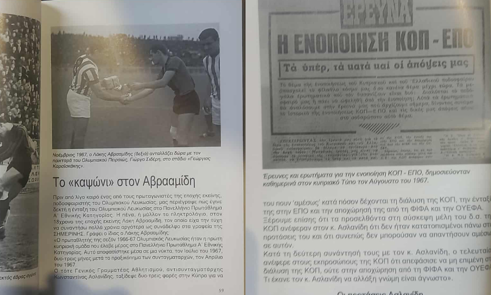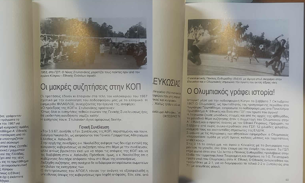«Η πιο αποκαλυπτική λεπτομέρεια προέκυψε την τελευταία στιγμή. Εκεί που το βιβλίο ολοκληρωνόταν, ήλθε μια δημοσίευση από το βιβλίο του διακεκριμένου συνάδελφου, Χριστού Σωτηρακόπουλου (Της Κυριακής τα είδωλα), ότι η στρατιωτική κυβέρνηση της Ελλάδας, αποφάσισε την ενοποίηση του κυπριακού με το ελλαδικό ποδόσφαιρο, προκειμένου να φέρνει, χωρίς να το υποψιάζεται κανένας, στρατό στην Κύπρο (πρακτικά συνεδρίας πενταγώνου)».