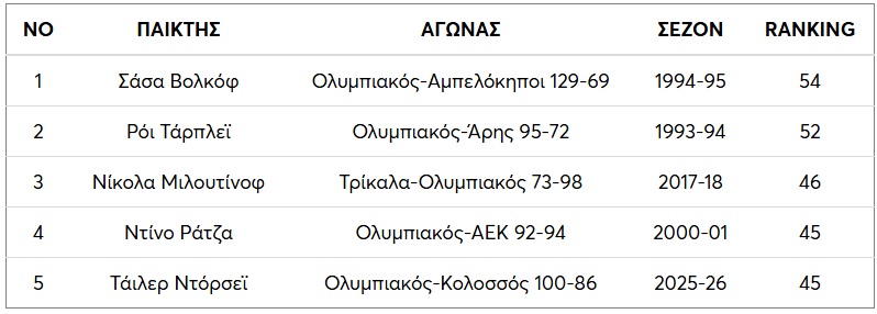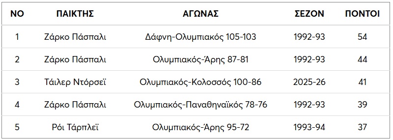 Επιπλέον, ο Τάιλερ Ντόρσεϊ σημείωσε την 39η επίδοση 41+ πόντων στην ιστορία της Stoiximan GBL και μόλις την 4η που ήρθε από Έλληνα παίκτη μετά από εκείνες των Στογιάκοβιτς, Κόμματου και Ρογκαβόπουλου.