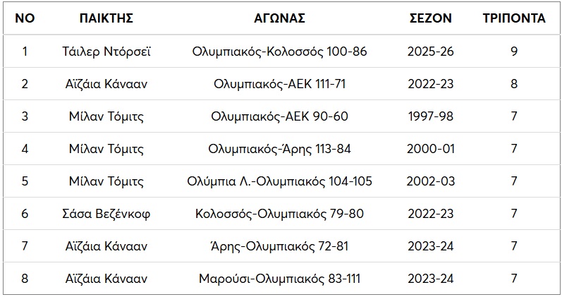 Ο διεθνής γκαρντ του Ολυμπιακού σημείωσε 9 τρίποντα (και 41 συνολικά πόντους), ξεπερνώντας έτσι τα 8 εύστοχα σουτ από τα 6.75 που είχε από την σεζόν 2022-2023 ο Αϊζάια Κάνααν. Με αυτό τον τρόπο έπιασε κορυφή στην λίστα με τα περισσότερα τρίποντα παίκτη του Ολυμπιακού σε έναν αγώνα.