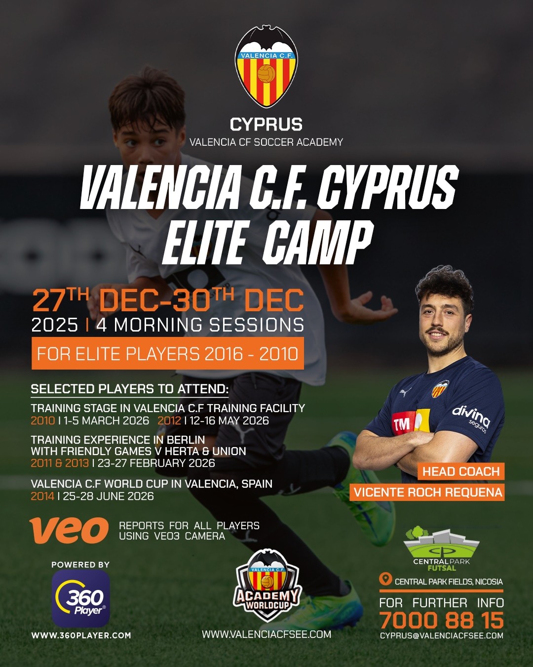 Συνεχίζονται οι εγγραφές για το 4ο ετήσιο Valencia C.F. Elite Camp, το οποίο θα πραγματοποιηθεί από τις 27 έως τις 30 Δεκεμβρίου 2025, στα γήπεδα Central Park Fields στην Αγγλική Σχολή, στη Λευκωσία, με διοργανωτή την Valencia CF Soccer Academy Cyprus.