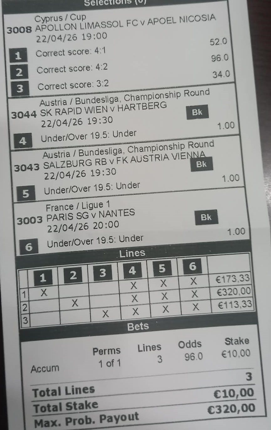 Ποντάροντας σε τρία διαφορετικά σκορ, το εν εξ αυτών, και το 4-2, το οποίο εν τέλει ήταν και το αποτέλεσμα της αναμέτρησης, ο φίλος μας – όπως φαίνεται και στο δελτίο που μας απέστειλε - πήρε ένα καλό πόσο.