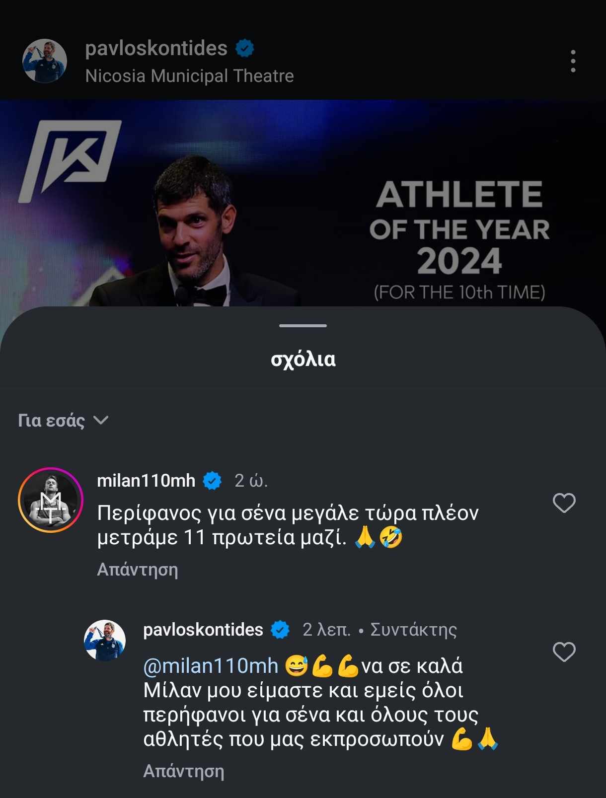 Σημειώνεται ότι ο Κοντίδης απάντησε: «Nα σε καλά Μίλαν μου είμαστε και εμείς όλοι περήφανοι για σένα και όλους τους αθλητές που μας εκπροσωπούν».