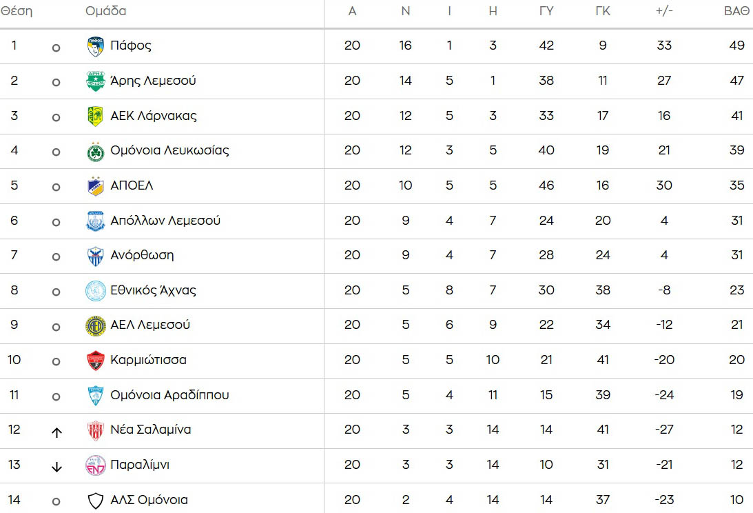 ΒΑΘΜΟΛΟΓΙΑ: Έβρεξε γκολ στην 20ή στροφή, κράτησε τις αποστάσεις η Πάφος FC, χαμένη η ΑΕΚ