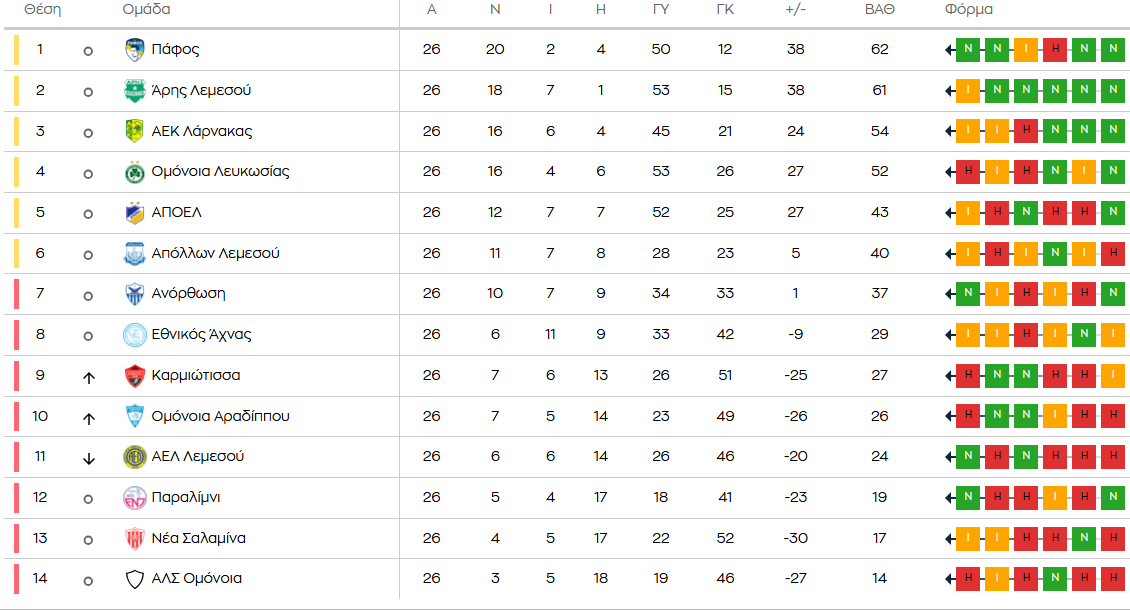 BAΘΜΟΛΟΓΙΑ: Χαρούμενη η Πάφος FC, λυπημένοι όλοι οι υπόλοιποι