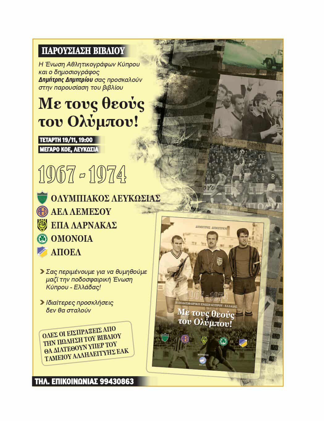 Η ΕΑΚ και ο συνάδελφος Δημήτρης Δημητρίου, ανακοινωνουν την έκδοση του βιβλίου, «Με τους θεούς του Ολύμπου», το οποίο θα παρουσιαστεί στη Λευκωσία στις 19 Νοεμβριου, στο Μέγαρο της ΚΟΕ.