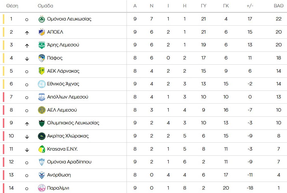 Τα δεδομένα όπως έχουν διαμορφωθεί με το πέρας τεσσάρων αγώνων για την 9η αγωνιστική στη Cyprus League by Stoiximan.
