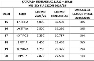 Η μία νίκη (η επική, της ΑΕΚ επί της Πάλας) και οι δύο ισοπαλίες (Πάφος, Ομόνοια) που πήραν οι ομάδες μας την προηγούμενη αγωνιστική (απολογισμός που στην τελική θα μπορούσε να ‘ταν και καλύτερος, αν και πριν το μεγάλο διπλό της ΑΕΚ στο Λονδίνο φάνταζε ιδανικός), μας έδωσαν ακόμη 1.000 βαθμούς, έτσι ανεβήκαμε στους 30.787. Και ναι μεν συνεχίζουμε να κατέχουμε τη 17η θέση, πίσω από Ελβετία (15η) και Αυστρία (16η), όμως, οι αποστάσεις έχουν μειωθεί και, ιδίως εάν οι ομάδες μας καταφέρουν να προχωρήσουν πέραν από τη League Phase (η ΑΕΚ έχει σχεδόν βέβαιο το εισιτήριο), δεν θα ΄ναι λίγες οι πιθανότητές μας να πετύχουμε το «θαύμα». Δεν είναι υπερβολικός ο χαρακτηρισμός, εάν αναλογιστεί κανείς πως ξεκινήσαμε τη σεζόν από την 20ή θέση και με απόσταση μεγαλύτερη των 6.000 βαθμών από τη 15άδα (και καλύφθηκε ήδη περίπου το 70% της διαφοράς)!