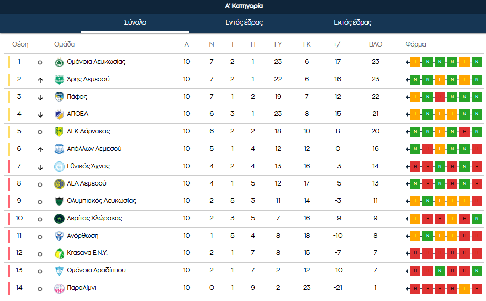 ΣΥΝΕΧΕΙΑ (11η αγων.): Πάφος FC-Άρης (21/11, 19:00), Ομόνοια Αρ.- Εθνικός Άχνας (22/11, 17:00), Ολυμπιακός-ΑΕΚ (22/11, 19:00), Ένωση- Ανόρθωση (23/11, 17:00), Απόλλων-Ομόνοια (23/11, 17:00), ΑΠΟΕΛ-ΑΕΛ (23/11, 19:00), Ε.Ν. Ύψωνα-Ακρίτας (24/11, 19:00)