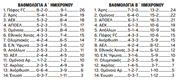 Ενδιαφέρον έχει η παρουσία της Πάφος FC σε αυτά τα δύο ημίχρονα. Στο πρώτο είναι η μοναδική που κατά τη διάρκειά του δεν χάνει, μετρώντας μόλις δύο ισοπαλίες και συγκομιδή 26 βαθμών. Και κατέχει την άτυπη πρωτιά σε αυτή την ειδική βαθμολογία. Όμως στο β΄ μέρος οπισθοχωρεί, έχοντας συγκομιδή 15 βαθμών, και αυτό, όπως είναι λογικό, της έχει στοιχίσει την πρωτιά στη συνολική βαθμολογία.