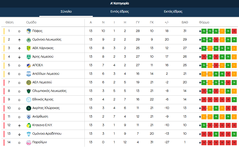 ΣΥΝΕΧΕΙΑ (14η αγων.): Ακρίτας-Εθνικός (13/12, 17:00), ΑΠΟΕΛ-Ε.Ν. Ύψωνα (13/12, 19:00), Ομόνοια Αρ.-Ανόρθωση (13/12, 19:00), Ολυμπιακός-ΑΕΛ (14/12, 16:00), Απόλλων-Άρης (14/12, 19:00), Ένωση-Πάφος FC (14/12, 19:00), ΑΕΚ-Ομόνοια (15/12, 19:00).