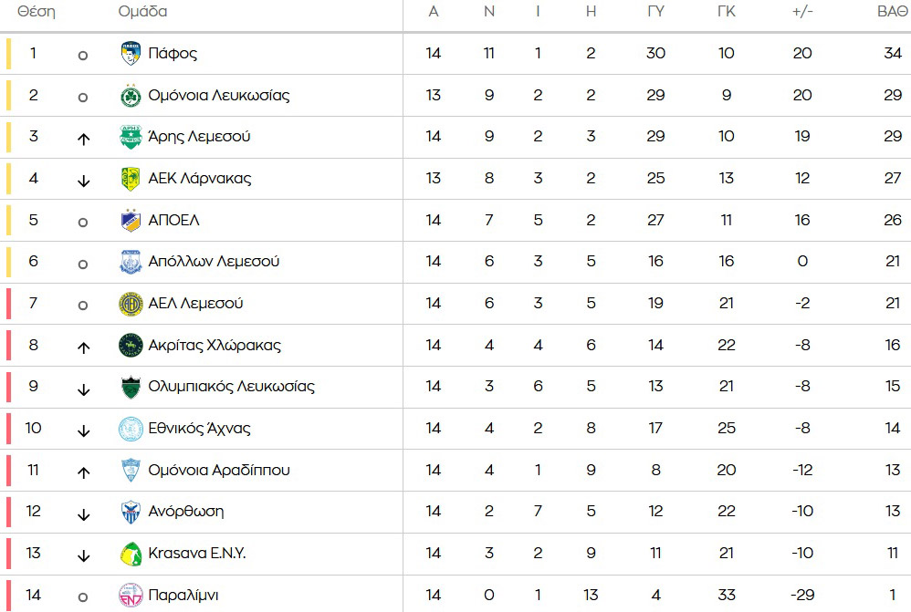 ΒΑΘΜΟΛΟΓΙΑ: H Πάφος FC που δεν δίνει δικαιώματα, η «απάντηση» του Άρη και η κομβική μάχη στην «Αρένα»