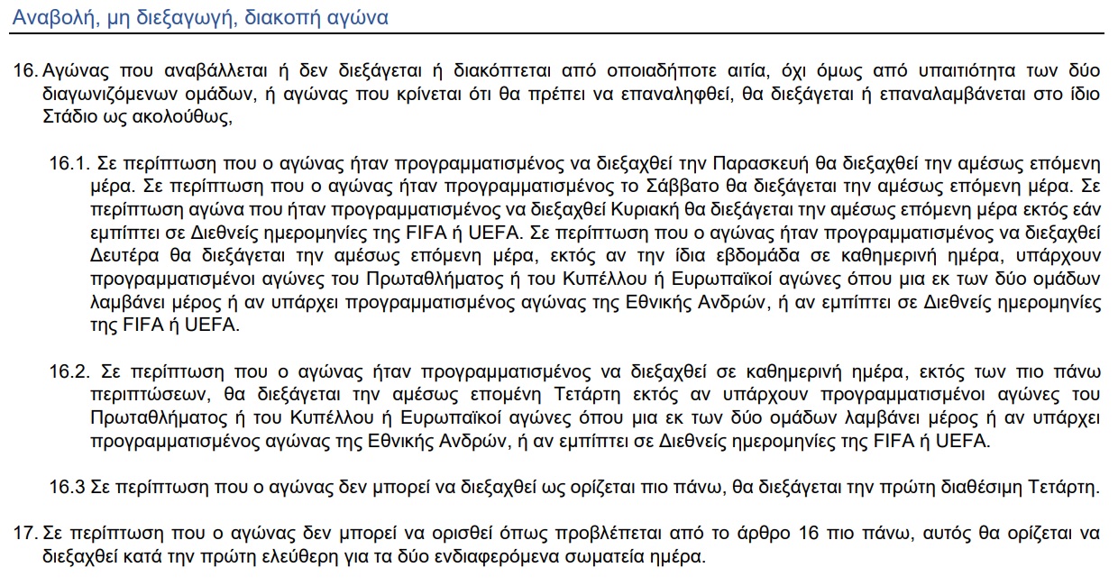 Συγκεκριμένα στο άρθρο 16 της προκήρυξης ορίζεται ότι, σε περίπτωση που αγώνας ο οποίος είναι προγραμματισμένος να διεξαχθεί Κυριακή και δεν διεξάγεται, όχι όμως από υπαιτιότητα των δύο ομάδων, θα διεξάγεται την αμέσως επόμενη μέρα (εκτός και αν εμπίπτει σε Διεθνείς ημερομηνίες της FIFA ή της UEFA, κάτι που εν προκειμένω δεν εφαρμόζεται).
