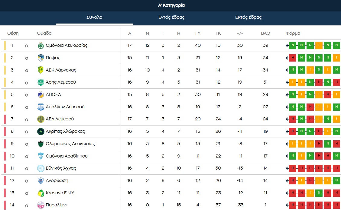 Από την άλλη η ΑΕΛ διατηρήθηκε στους 24 βαθμούς και κινδυνεύει να δει τη διαφορά της από την εξάδα να διευρύνεται στους έξι βαθμούς εάν ο Απόλλωνας πάρει διπλό στο Παραλίμνι.