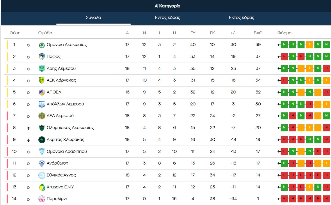 Ξεχώρισε η σπουδαία νίκη του Ολυμπιακού επί της Πάφου με 2-0 η οποία δημιουργεί νέα δεδομένα στην κορυφή, καθώς η Ομόνοια με τυχόν νίκη την Κυριακή επί της Ανόρθωσης θα ξεφύγει στο +5 από τη δεύτερη θέση και θα κατέχει την πρωτιά χωρίς την... υποσημείωση ότι θα έχει αγώνα περισσότερο (δεδομένου ότι η Πάφος «χρωστά» το ματς με τον ΑΠΟΕΛ). Οι μαυροπράσινοι με τη μεγάλη τους νίκη ανέβηκαν στους 20 βαθμούς κι απομακρύνθηκαν από τη ζώνη του υποβιβασμού.