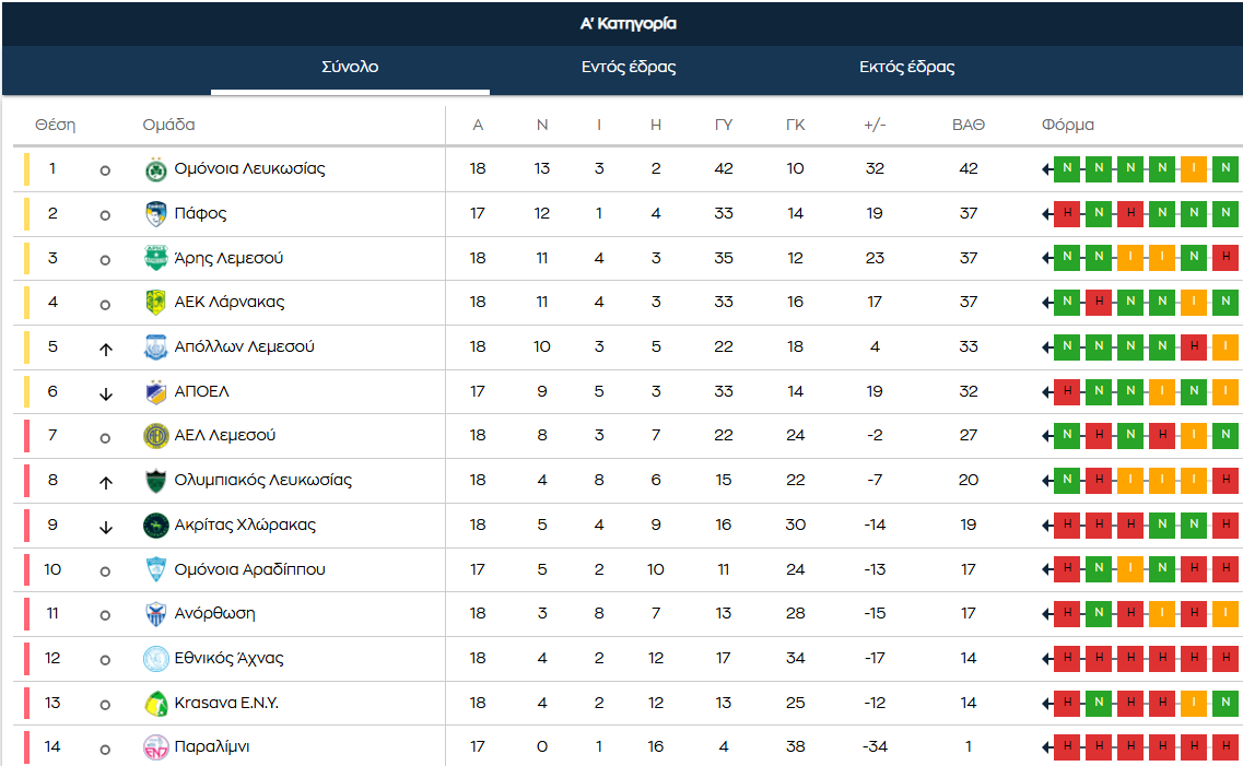 Η πρώτη στη βαθμολογία Ομόνοια συνεχίζοντας τη σπουδαία κούρσα που πραγματοποιεί το τελευταίο διάστημα, νίκησε με 2-0 την Ανόρθωση, έφτασε στις τέσσερις σερί νίκες και αύξησε τη διαφορά από τη 2η θέση στους πέντε βαθμούς, εκεί όπου πλέον βρίσκονται η Πάφος FC, ο Άρης και η ΑΕΚ που επικράτησε δύσκολα με 2-1 την Freedom24 Krasava ΕΝΥ .