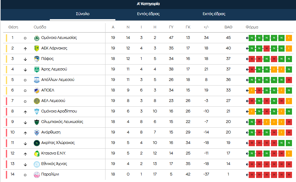 ΒΑΘΜΟΛΟΓΙΑ: Ξέφυγε η Ομόνοια, στο ξοπίσω της η ΑΕΚ και η ανάσα της Ανόρθωσης