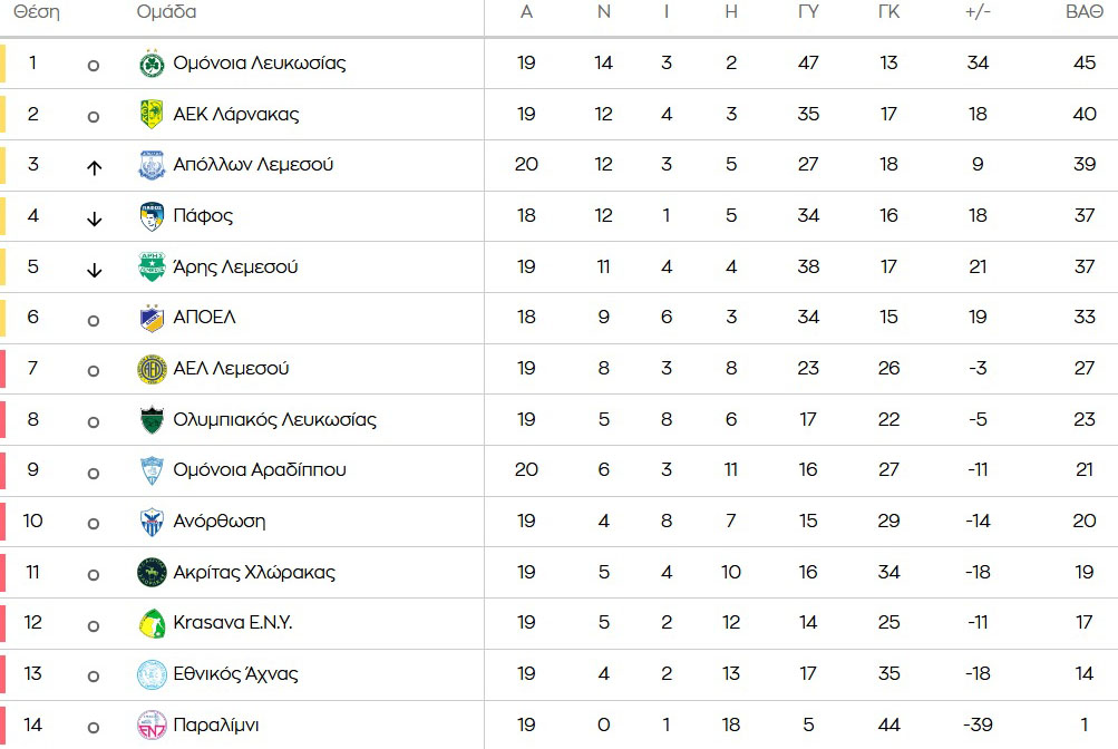 Στην 3η θέση του βαθμολογικού πίνακα, παρόλο που έχει παιχνίδια περισσότερα φιγουράρει ο Απόλλωνας μετά το διπλό που πέτυχε κόντρα στην Ομόνοια Αραδίππου, στο παιχνίδι που άνοιξε την αυλαία της 20ης αγωνιστικής.