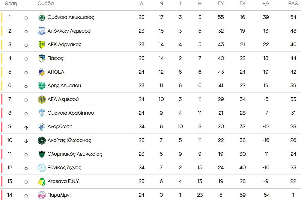 Δείτε πως έχει διαμορφωθεί το σκηνικό με το πέρας τριών παιχνιδιών της 24ης αγωνιστικής για τη Cyprus League by Stoiximan.
