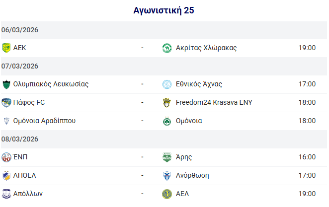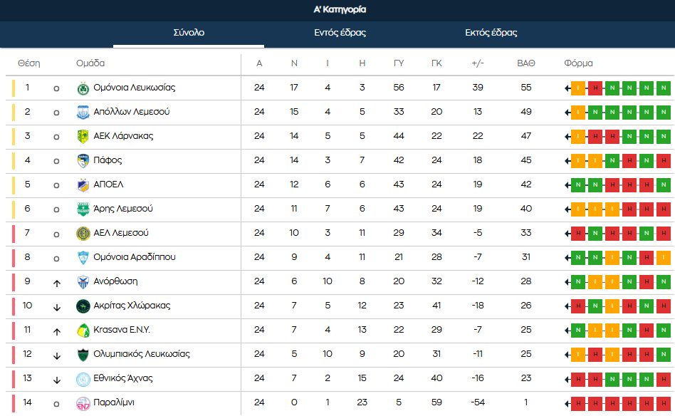 Με το μεγάλο ντέρμπι κορυφής, ανάμεσα στην Ομόνοια και τον Απόλλωνα, το οποίο έληξε 1-1, ολοκληρώθηκε και η 24η αγωνιστική της Cyprus League By Stoiximan.