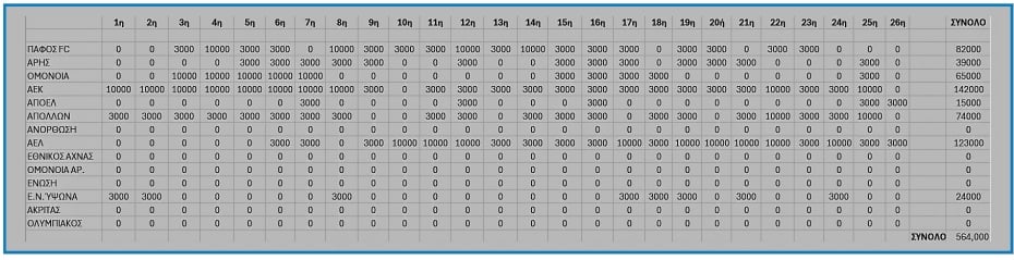 Συγκεκριμένα, έως την 26η αγωνιστική το συνολικό ποσό που κλήθηκαν να καταβάλουν οι ομάδες ανέρχεται στις 564.000 ευρώ. Υπενθυμίζεται ότι η απουσία γηγενή ποδοσφαιριστή από το αρχικό σχήμα μιας ομάδας επιφέρει πρόστιμο 10.000 ευρώ, ενώ για την παρουσία μόλις ενός η οικονομική επιβάρυνση είναι 3.000 ευρώ.