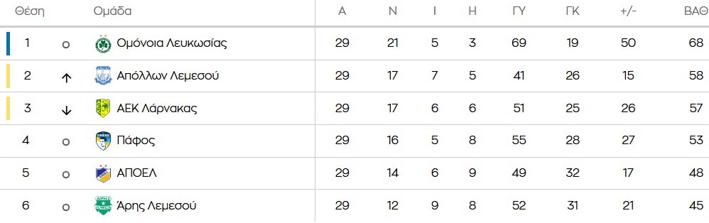 ΒΑΘΜΟΛΟΓΙΑ: Φτιάχνει χώρο στη βιτρίνα η Ομόνοια, ξανά προσπέρασμα ο Απόλλωνας
