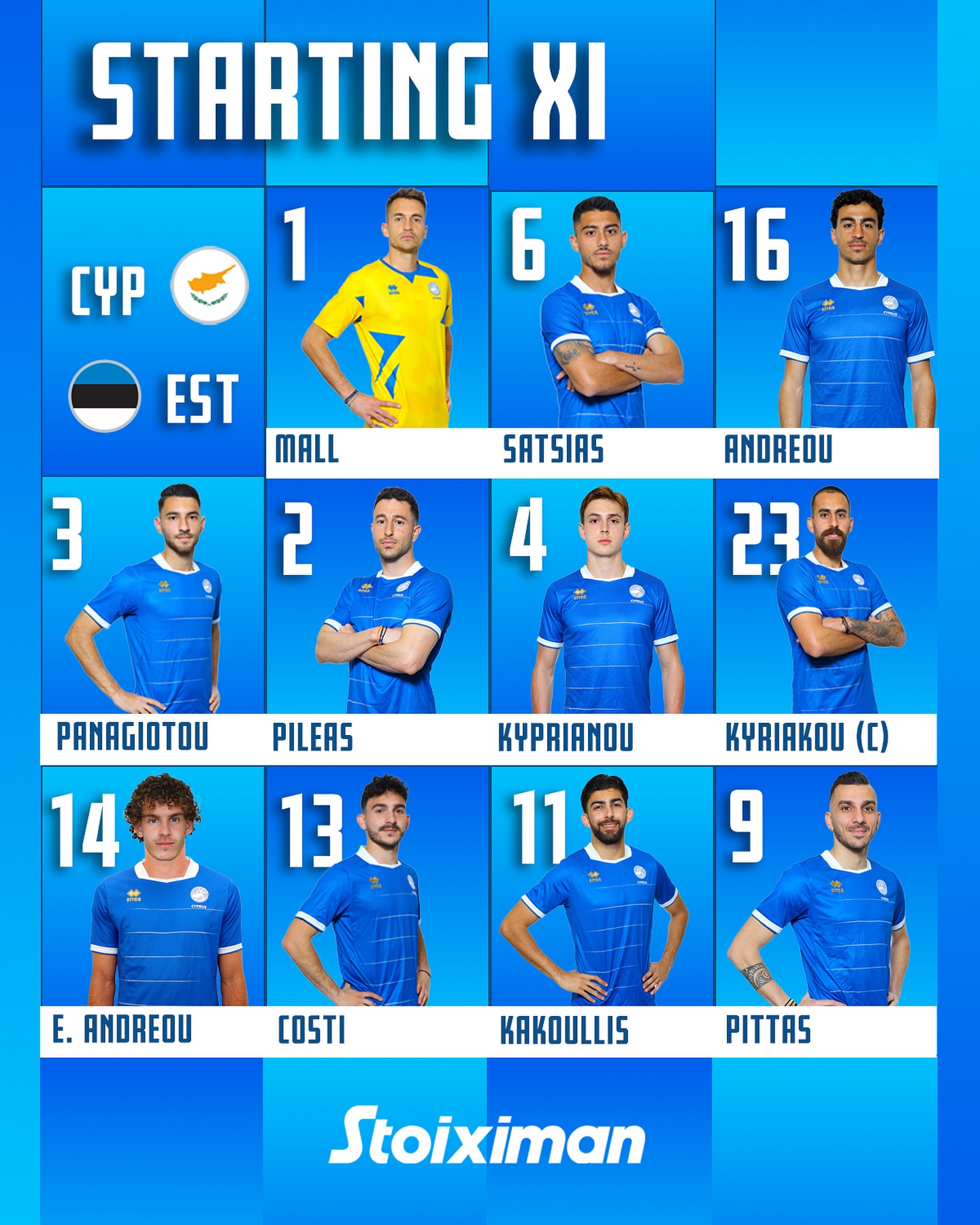 Η ενδεκάδα της Κύπρου: Μολ, Σατσιάς, Σ. Ανδρέου, Κυπριανού, Παναγιώτου, Πηλέας, Κυριάκου, Κωστή, E. Ανδρέου, Κακουλλής, Πίττας.