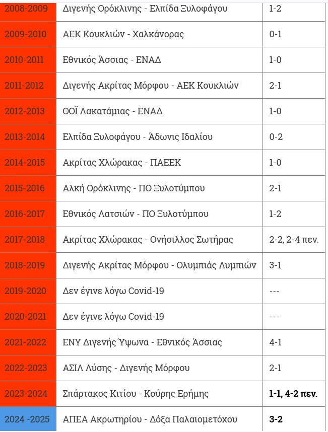 Ο πρώτος τελικός έγινε το 2009 στο Δασάκι Άχνας μεταξύ της Ελπίδας Ξυλοφάγου και του Διγενή Ορόκλινης και μετά το 0-0 στην κανονική διάρκεια του αγώνα, επικράτησε με 2-1 στη διαδικασία της παράτασης η Ελπίδα Ξυλοφάγου.