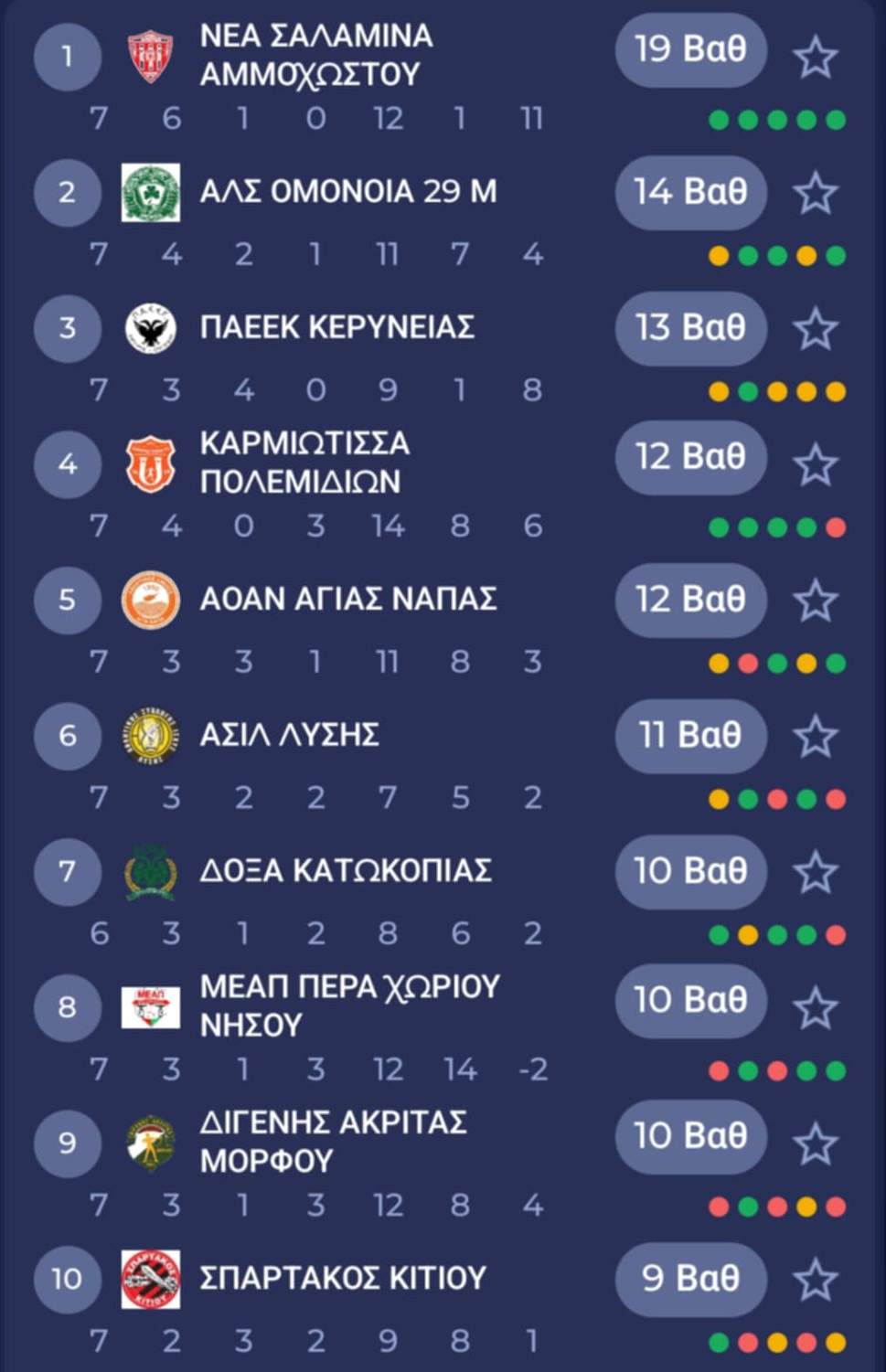 Με αυτή τη νίκη φιγουράρουν πλέον στην 2η θέση (14 βαθμούς) και στο -5 από τη Νέα Σαλαμίνα, κάνοντας ωστόσο σημαντικό βαθμολογικό άλμα. Για την ομάδα των Πολεμιδιών ήταν η δεύτερη σερί ήττα που τους κρατά στην 4η θέση με δώδεκα βαθμούς.